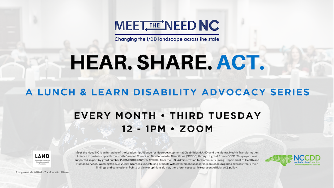 To help address these two crises, NCCDD has funded a four-year grant for the Mental Health Transformation Alliance (MHTA) to develop and carry out a coordinated approach to positively impact the Medicaid Innovations Waiver waiting list in North Carolina. The Leadership Alliance of Neurodevelopmental Disabilities (LAND), a program of MHTA, is leading the groundbreaking initiative.
